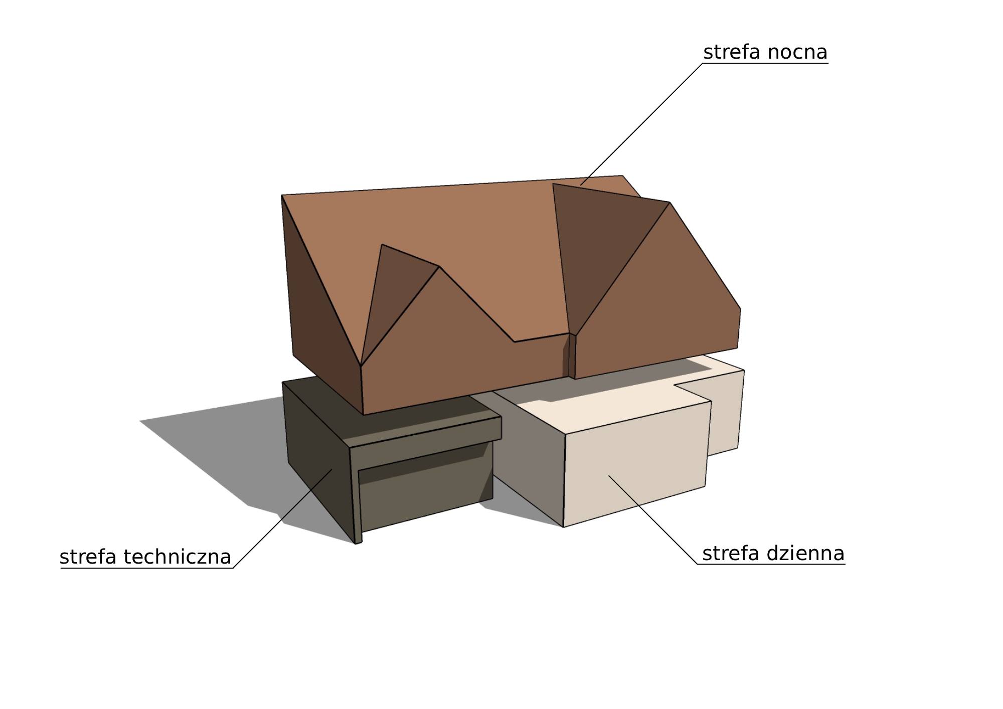 Projekt domu dzieli przestrzeń na trzy główne strefy: